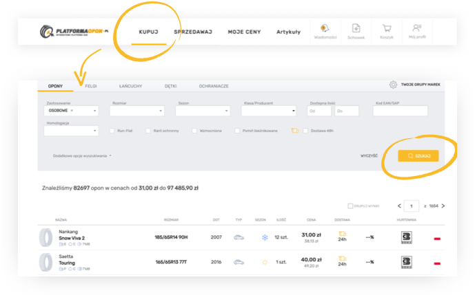 Wejdź w zakładkę Kupuj i wybierz kategorię produktu, który Cię interesuje. Podaj jego parametry i kliknij Szukaj.