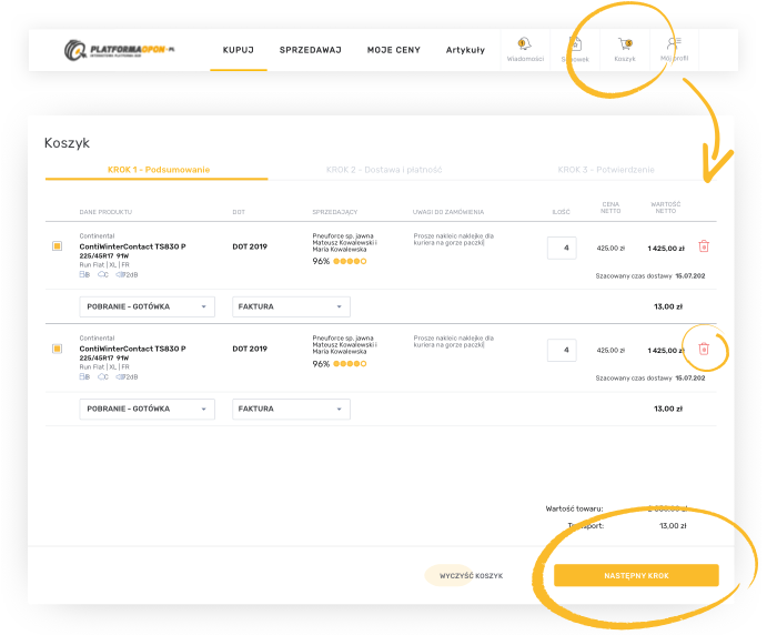 Aby złożyć zamówienie poprzez Platformę, wyszukaj interesujące Cię produkty i dodaj je do koszyka. W koszyku zweryfikuj swoje zamówienie. Jeśli wybrana ilość oraz produkty są odpowiednie, w kolejnym kroku potwierdź jakie dane mają znaleźć się na dokumencie zakupowym oraz wybierz adres dostawy i zatwierdź zamówienie.