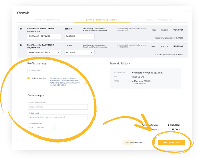 Wybierz formę płatności i potwierdzenia zakupu oraz profil dostawy (jeśli wybierasz nowy profil dostawy, uzupełnij adres dostawy i dane zamawiającego).