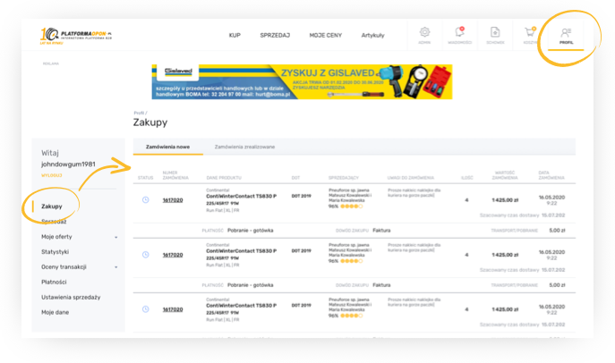 Historię swoich zamówień możesz sprawdzić na swoim koncie klikając w „MÓJ PROFIL”. Następnie należy wejść w zakładkę „ZAKUPY” lub „SPRZEDAŻ” w zależności, które zamówienia chcesz sprawdzić a następnie kliknąć opcję „ZAMÓWIENIA ZREALIZOWANE”. Znajdują się tam wszystkie zamówienia, które zostały oznaczone jako Wysłane lub Odrzucone które możesz odszukać, wyfiltrować oraz podejrzeć.