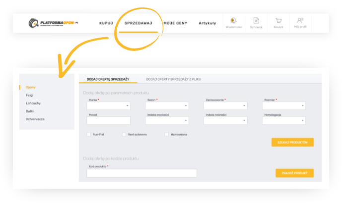 Panel „MOJE PRODUKTY” służy do dodawania nowych pozycji na Platformie lub podpięcia z już istniejącymi. Oferty na Platformie są tworzone tylko do produktów, które znajdują się w bazie. Jeśli posiadasz nowy produkt, o nowych kodach, w pierwszej kolejności dodaj go do panelu produktów „NIEZWERYFIKOWANYCH”. Podaj wszystkie jego parametry i zgłoś do naszej akceptacji. Po zaakceptowaniu takiego produktu, możesz utworzyć nową ofertę sprzedaży. Za pomocą tego panelu możesz również przypisać dodawany produkt do już istniejącego, w przypadku kiedy np. nie posiadasz oryginalnego kodu SAP/EAN. Nadajesz wówczas swój kod do danej opony, a następnie za pomocą dedykowanego narzędzia wyszukujesz podobne pozycje, które już znajdują się w bazie i podpinasz do niego ten produkt. Po stworzonym kodzie będzie możesz utworzyć ofertę na ten produkt.