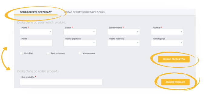 Pojedynczą ofertę sprzedaży możesz wystawić na 2 sposoby. W obu przypadkach wejdź w zakładkę „SPRZEDAWAJ”. Następnie masz 2 sposoby wyszukania produktu, na który chcesz wystawić ofertę: po kodach producenta SAP/EAN lub po parametrach produktu. Po wyszukaniu i zweryfikowaniu produktu, na który chcesz wystawić ofertę, określasz jego cenę, dostępną ilość a także czas dostawy. Możesz również określić dodatkowe parametry oferty. Po dodaniu oferty będzie ona dostępna na liście wyszukiwania.