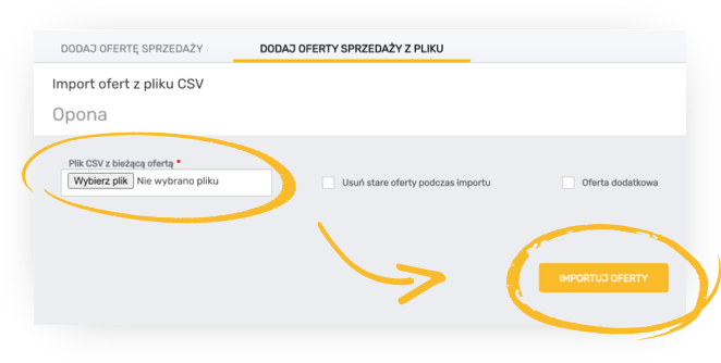 Jeśli plik CSV jest już gotowy, kliknij przycisk Wybierz plik i zaczytaj go ze swojego komputera. Zaznacz opcję Usuń stare oferty podczas importu i kliknij Importuj oferty.